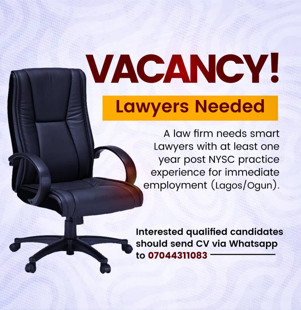 Mary Akanbi 29th September, 2025 A frontline litigation law firm with head office in Lagos invites applications from passionate and committed lawyers to work for the firm in Mowe, Lagos-Ibadan Expressway, Ogun State. Requirements: Minimum of one year post-call. Demonstrable capacity to draft processes, conduct research, and handle court appearances independently. Excellent writing, research, communication…