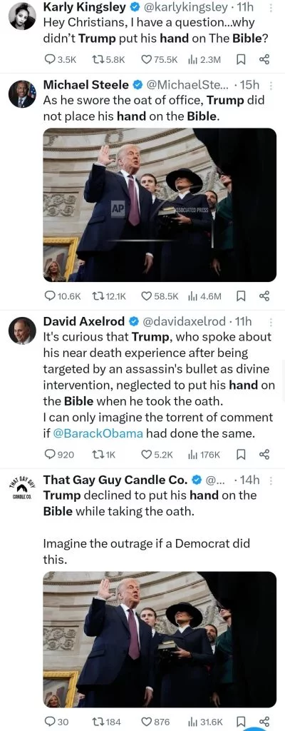 But when it was Trump’s turn, he chose to have his hand my his side, instead of on the Bible.