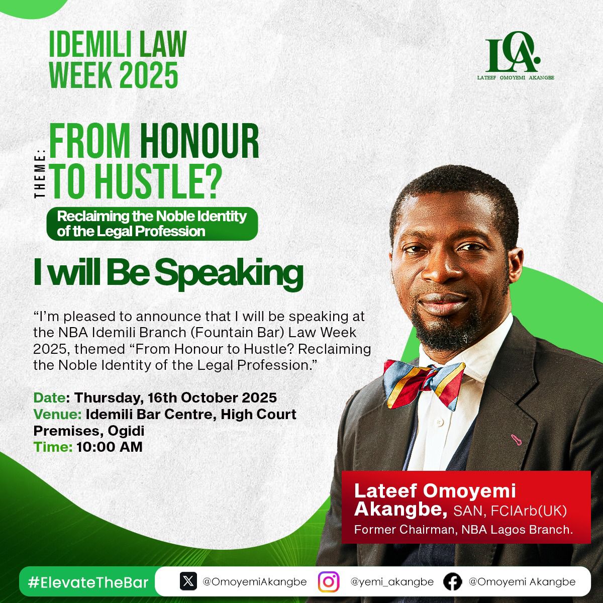 Lateef Omoyemi Akangbe, SAN will be speaking at the NBA Idemili Branch (Fountain Bar) Law Week 2025, themed:
