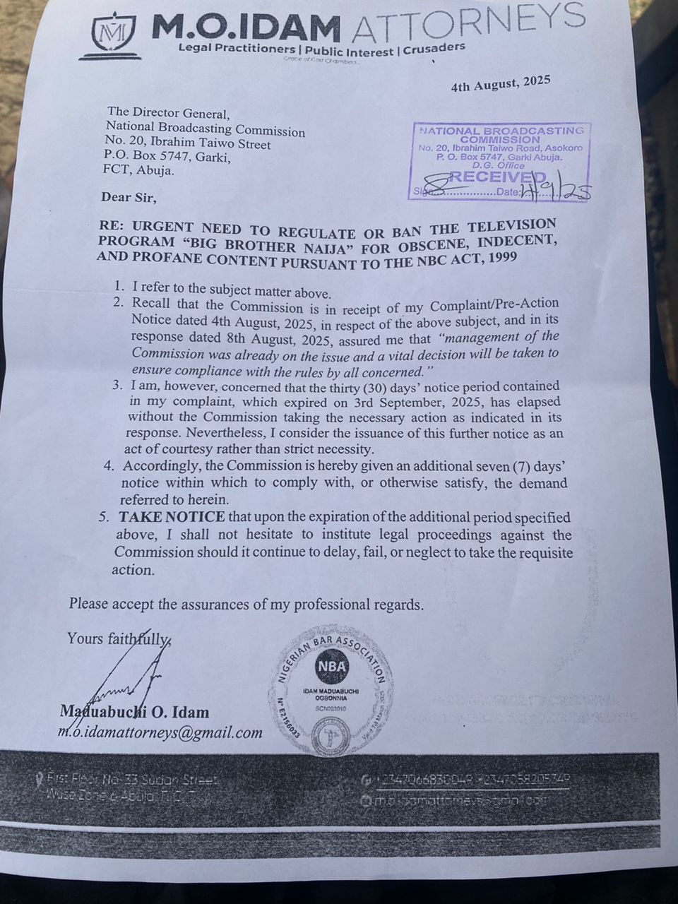 Following the expiration of the Thirty (30) Days pre-action notice on the 3rd of September, 2025 without the Commission’s compliance, Maduabuchi Idam Esq has as a gesture of goodwill served additional Notice of Seven (7) days to the National Broadcasting Commission (NBC).