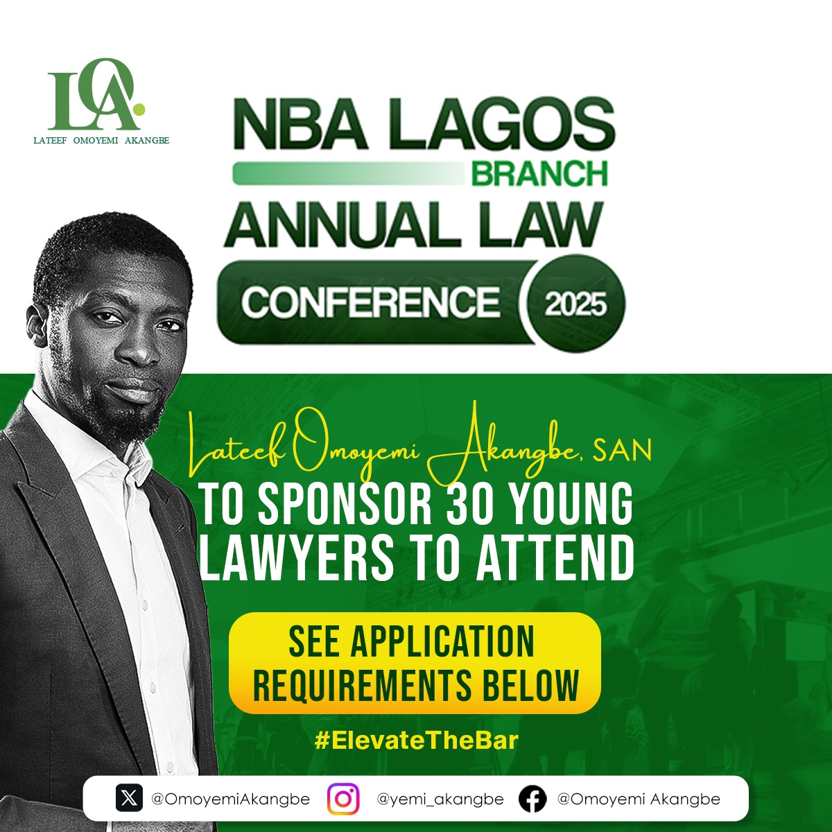 Lateef Omoyemi Akangbe SAN, FCIArb(UK), Former, Chairman, NBA Lagos Branch declares sponsorship for 30 young lawyers to the NBA Lagos Branch Annual Law Conference 2025.