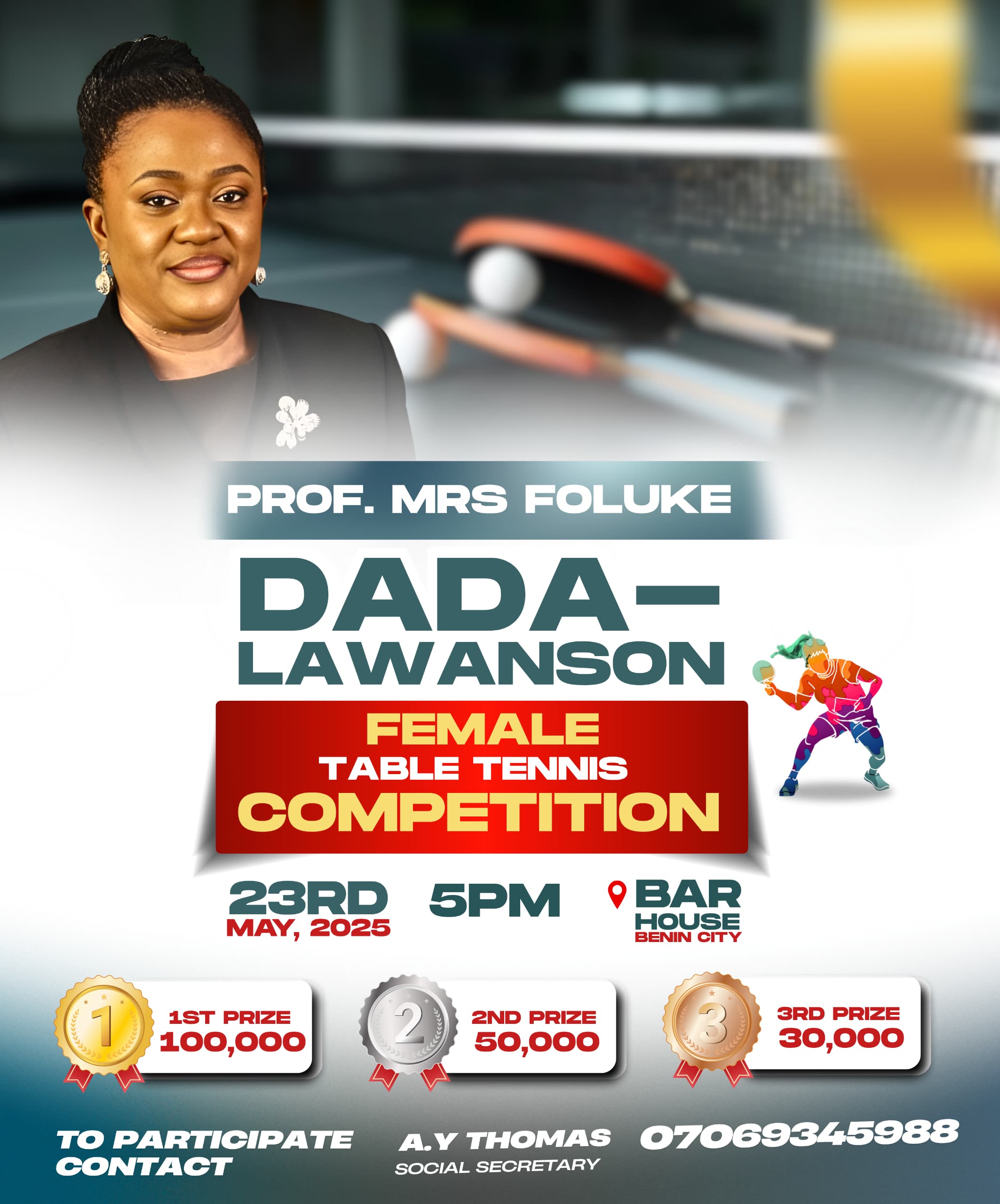 We extend our deepest gratitude to Professor Mrs. Foluke Dada-Lawanson for her remarkable generosity and unwavering support in hosting the Female Table Tennis Competition in Benin City.